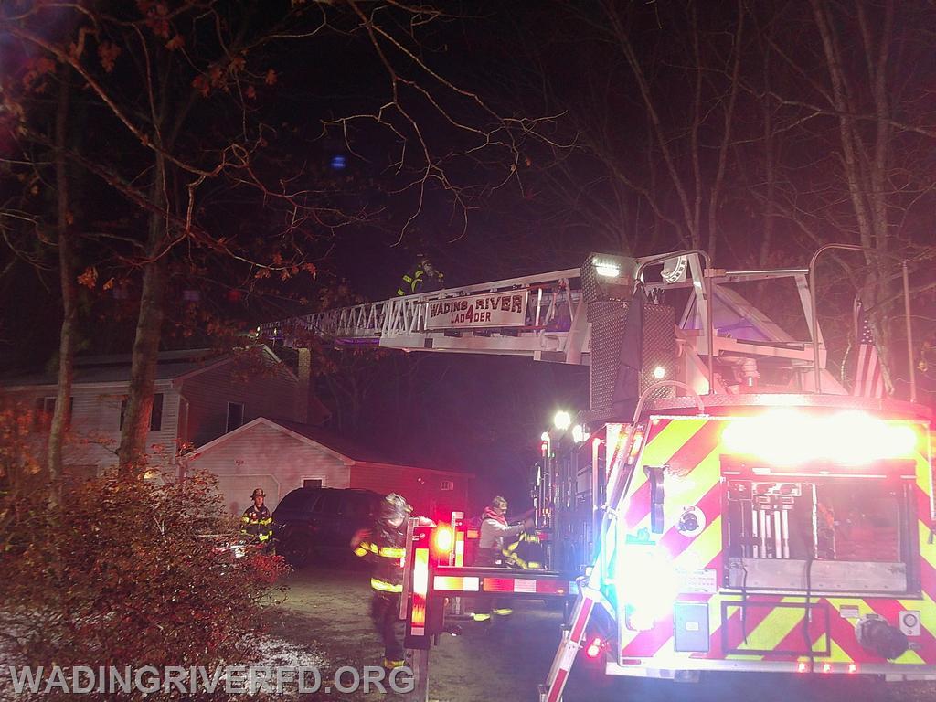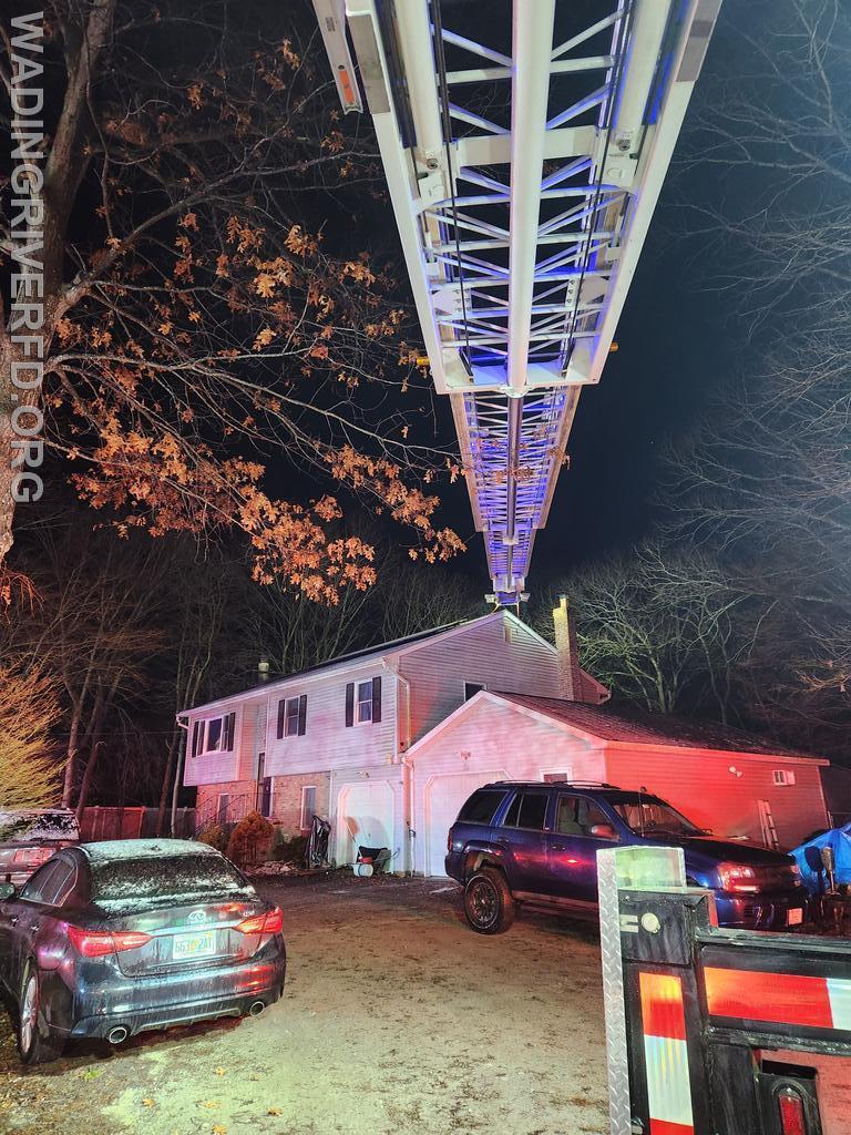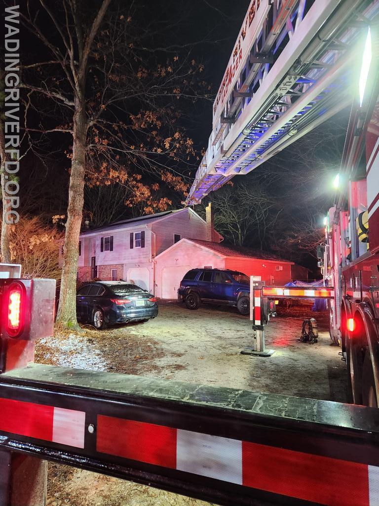 On Thursday 3-12-26, shortly after the members of WRFD had concluded an evening of training, Ridge Fire Department requested mutual aid from WRFD for a ladder and and an engine to respond to the scene of a "working" residential structure fire. WRFD Ladder4 (6-3-4) and Tanker 2 (6-3-2) were responding within minutes, followed by Chief of Department Thomas Whelan (6-3-30). WRF District Paramedic (6-3-80) also responded to provide "cyano kits" to the Ridge FD medics. Ladder 4 was the 1st due truck and due to numerous trees in the front yard, positioned themselves in the driveway of the home so they would have access to the house. Ladder 4's crew went to work inside the home conducting a search and opening up the ceiling as the fire was in the attic. Ladder 4 was set up to the roof and a team was sent to investigate andprovide vertical ventilation. Tanker 2's crew arrived and provided manpower at the front door. Ridge FD made an aggressive interior attack and knocked down the fire quickly.
