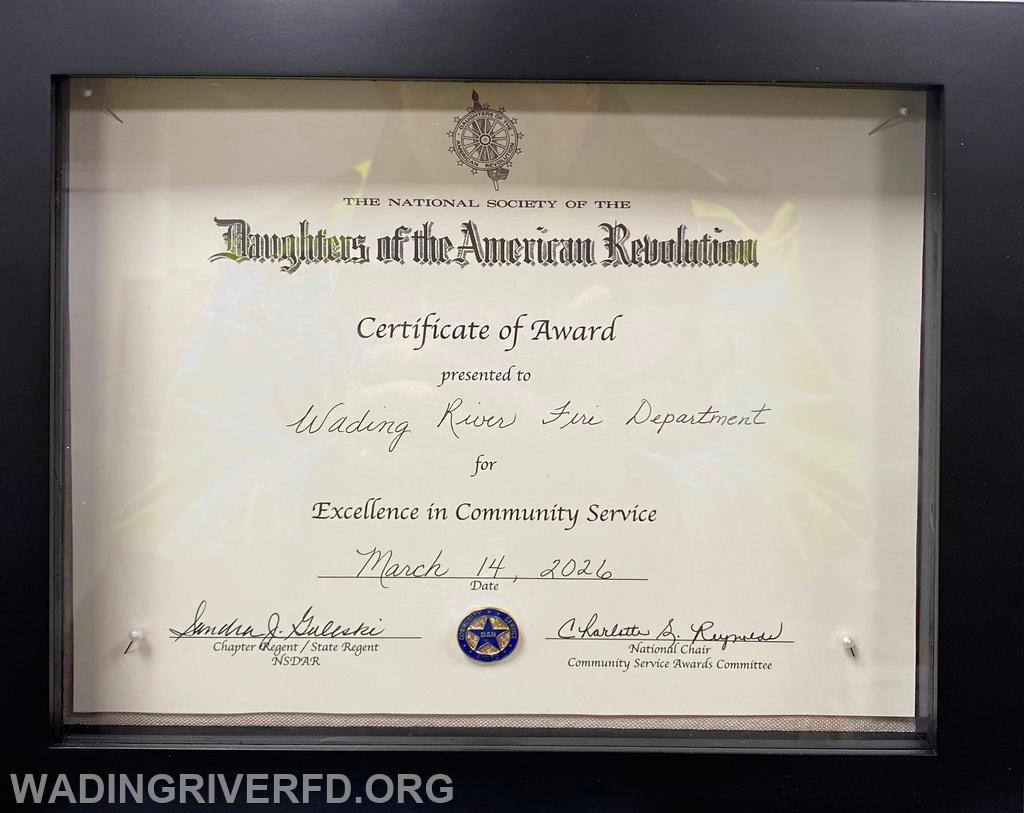 | On Friday, March 14th, the Wading River Fire Department was honored by the Daughters of the American Revolution for the many years of community service it has provided to the residents of Wading River.